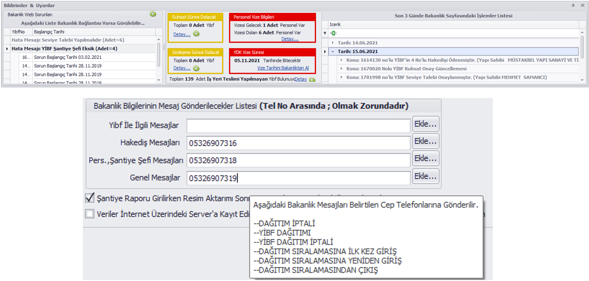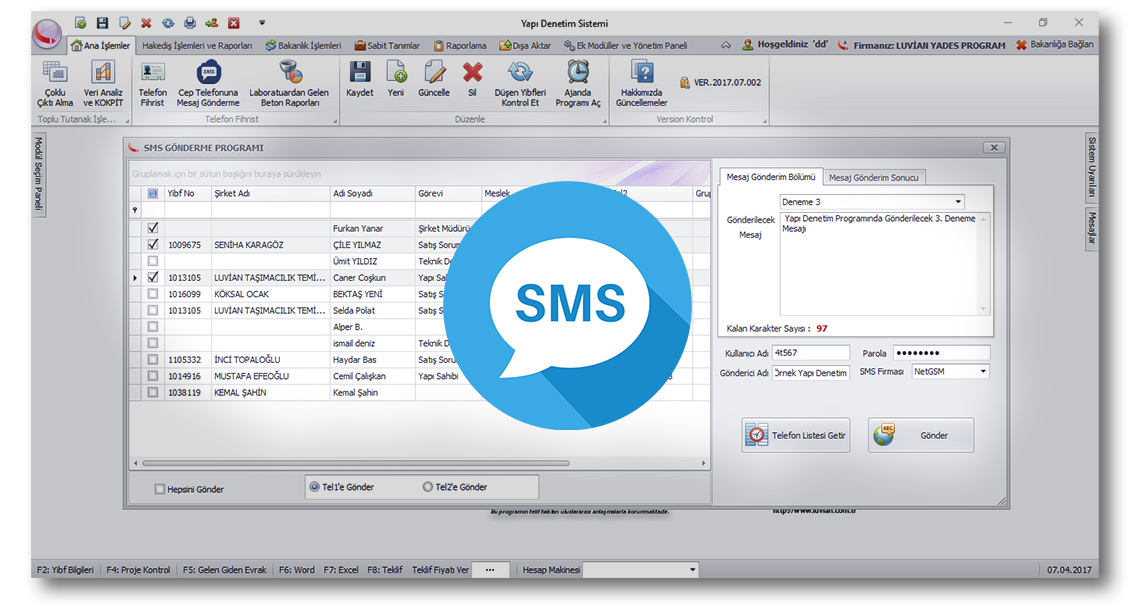 Firmanızda telefon fihrist modülü sayesinde usta, kalfa, şantiye şefi, müteahhit, yapı sahipleri, denetçi ve müellifler gibi ilgili herkesin telefonlarını kayıt edebilir ve bunların cep telefonlarına mesaj gönderebilirsiniz.
