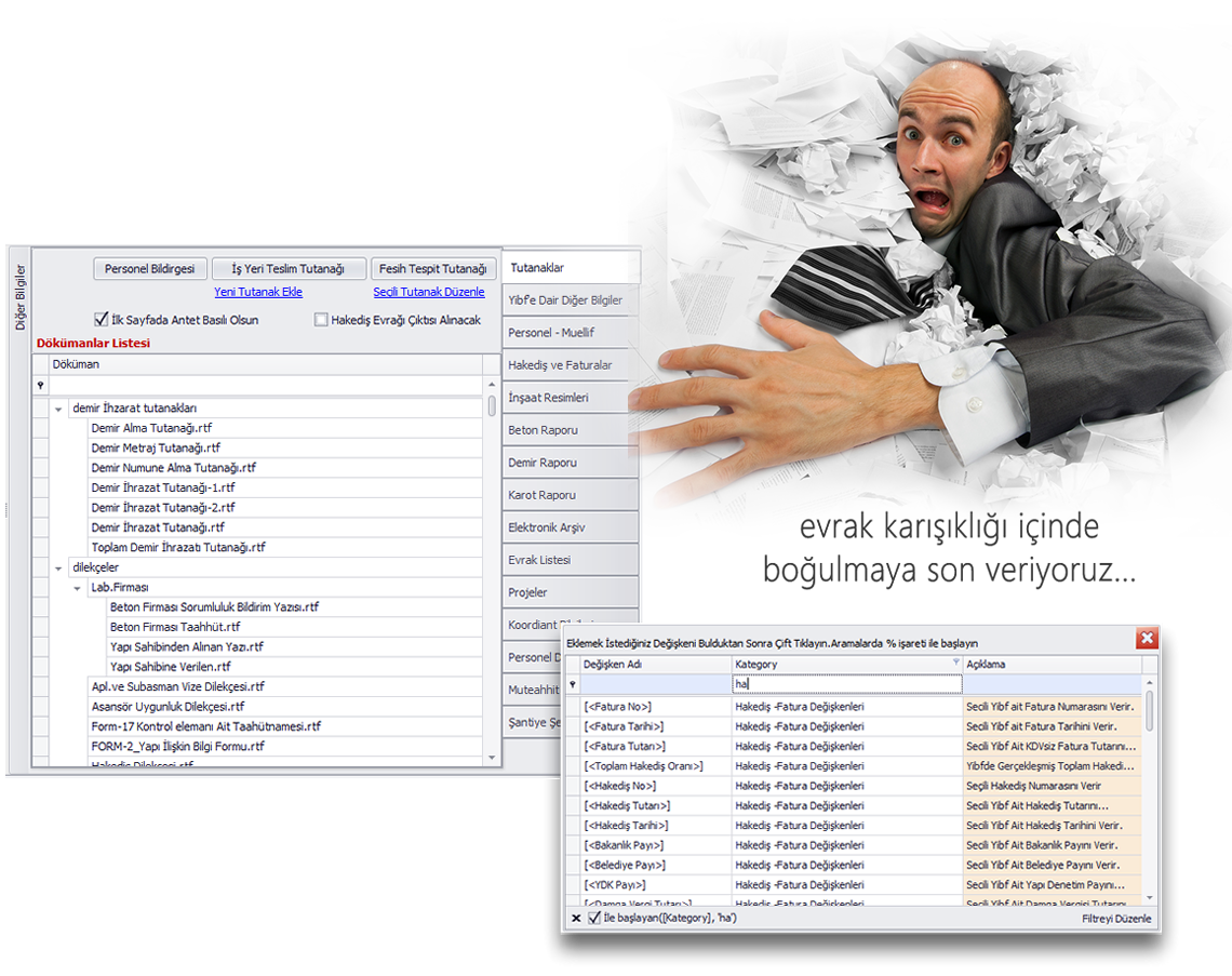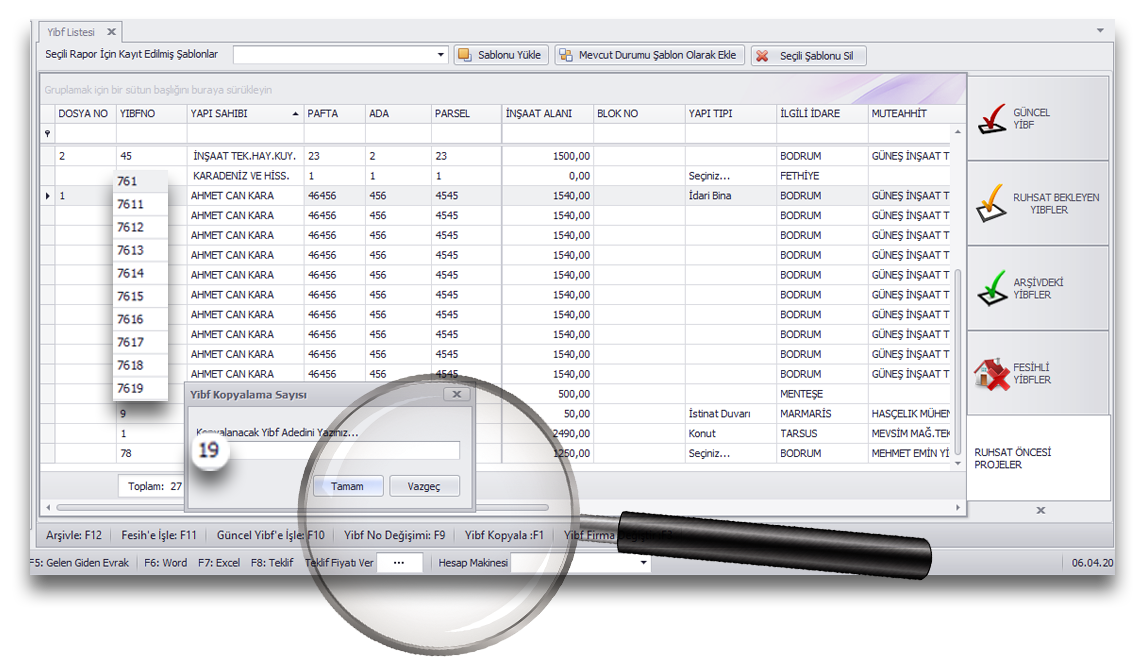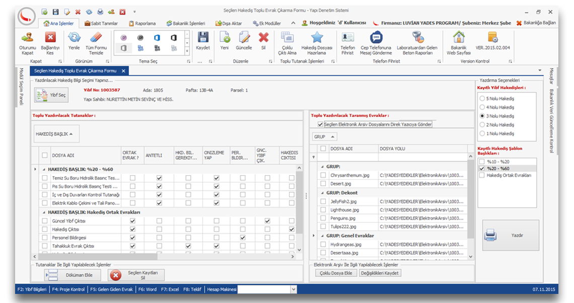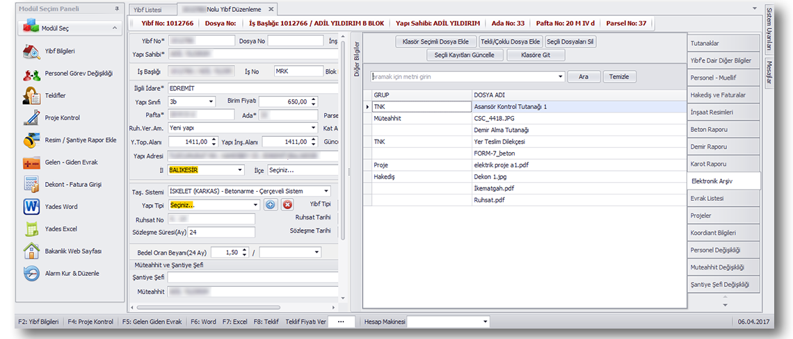 yibf çıktısını alır elektronik arşivden ruhsat dekont vb gibi çıktıları alır ve inşaatın seviyesine göre temel topraklama, çatı kontrol, ısı yalıtım vizesi ve vb gibi tutanakların çıktılarını verir. Bu modül işlerinizi %70 hafifletir.