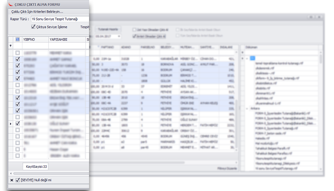 Yıl sonu seviye tespit tutanakları, fesih yada kapanma nedenli tutulan seviye tespit tutanakları, bir ada pafta parselde bloklar için hazırlanması gereken temel topraklama tutanağı ve benzeri gibi çoklu yibf seçerek bir tutanak çıkarmak istediğinizde işinizi son derece kolaylaştıracak bir modüldür. Özellikle yıl sonu seviye tespit ve diğer seviye tespitlerde işlemi dakikalar içerisinde bitirmenizi sağlar.