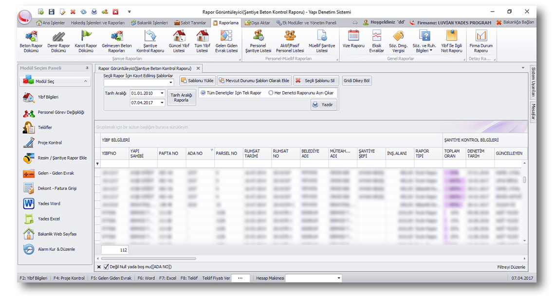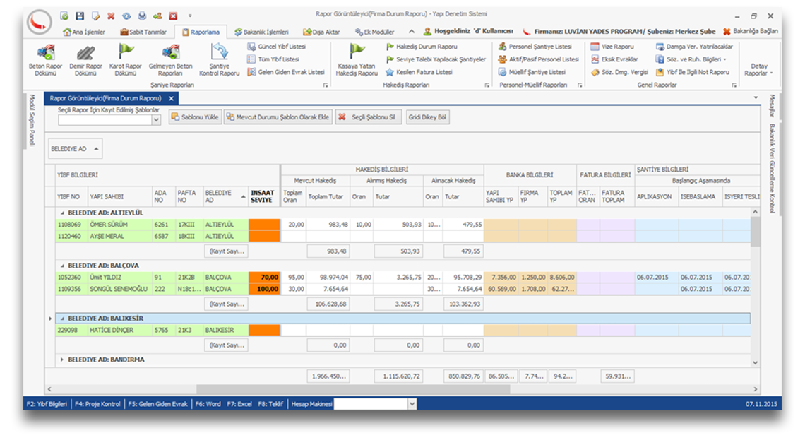 Yapı denetimde çalışan inşaat, belediye, idari, muhasebe gibi tüm birimlerin istediği raporları alabilmesi için kullanılan çok detaylı bir rapor örneğidir. Kullanıcılar kendine göre özelleştirebilir şablonlar ekleyebilirler. Bu rapor sayesinde şantiyeciler vizeleri ve inşaat seviyelerini takip edebilirken; idari birim belediye bazlı yapılmış olan hakediş tutar oranlarını, tahsil edilen ve edilmeyen hak edişler şeklinde; ya da belediye bazlı müteahhit listesini alabilirler. Bu raporda yüzlerce farklı şekilde rapor almanız mümkündür. Örneğin 2016 yılında 1000 m2 altında ruhsat almış işlerinizi belediye bazlı gruplandırarak tek bir tıkla alabilirsiniz.