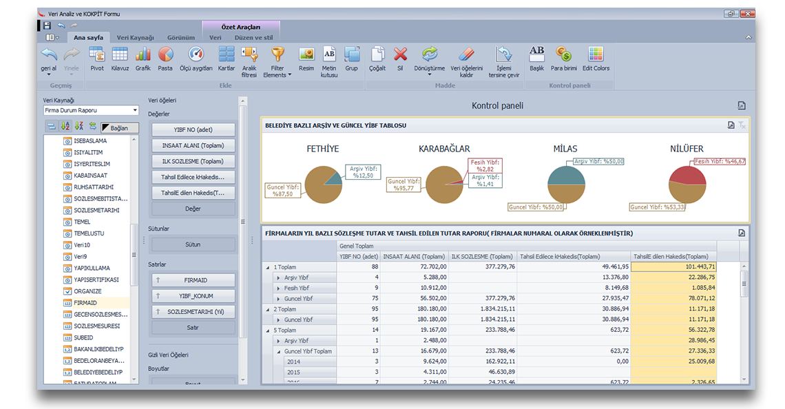 Bu modül özellikle birden çok firması olan kuruluşlar için hazırlanmıştır. Buna rağmen tek firması olan yapı denetim firmalarıda kullanabilir. Birden fazla firması olan kuruluşlar; grafikler, listeler, pivot tablolar oluşturarak tüm firmaları için istediği tüm raporları bu modülden alabilmektedir. Örneğin yıl bazlı firmalarınızın belediyelerde tahsil ettiği hakedişlerinizin tutarlarını yada firmalarınızın yıl bazlı almış olduğu yibflerin belediyelere göre dağılımını grafiksel olarak alabilirsiniz.