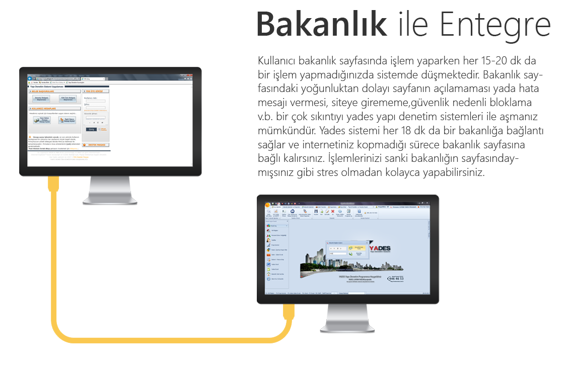Bakanlık entegrasyonu ile; bakanlık sayfasına hiç yönlendirilmeden direk yades in bakanlığa bağlı olmasıyla yeni Yibf girme, bakanlık aylık denetim bilgilerini gönderme, hakediş ve yibf verilerini kontrol etme ve toplu hakediş seviye ve ödeme talep etme şlemelerinin yanı sıra; yibf, sözleşme, tahahütname yazdırma, denetçi bilgileri , KE, YKE listesini vb’leri kontrol etme olanağı da sağlar.