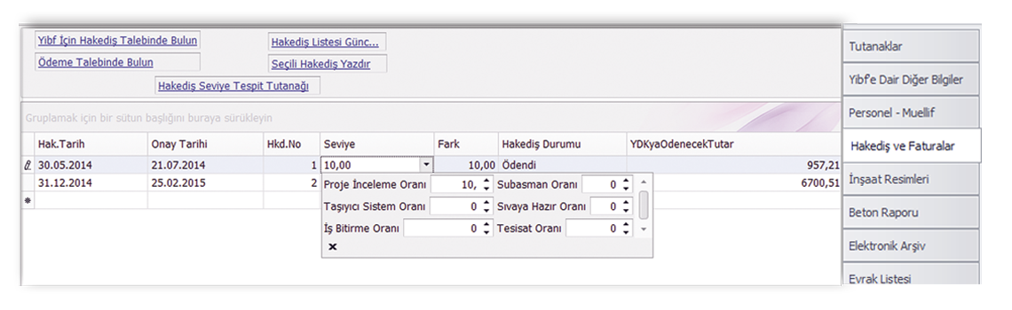Bu bölümde, seçilen Yibf bazında mal müdürlüğüne yatırılmış olan dekontlar işlenebilir, “tarih”, “belge no”, “ilgili idare” vs. gibi başlıklar bazında filtrelenerek listelenebilir. Yine bu bölümde, seçilen Yibf bazında hakedişler manuel ya da bakanlık web sayfasından alınarak kaydedilip listelenebilir, fatura girişi yapılabilir.